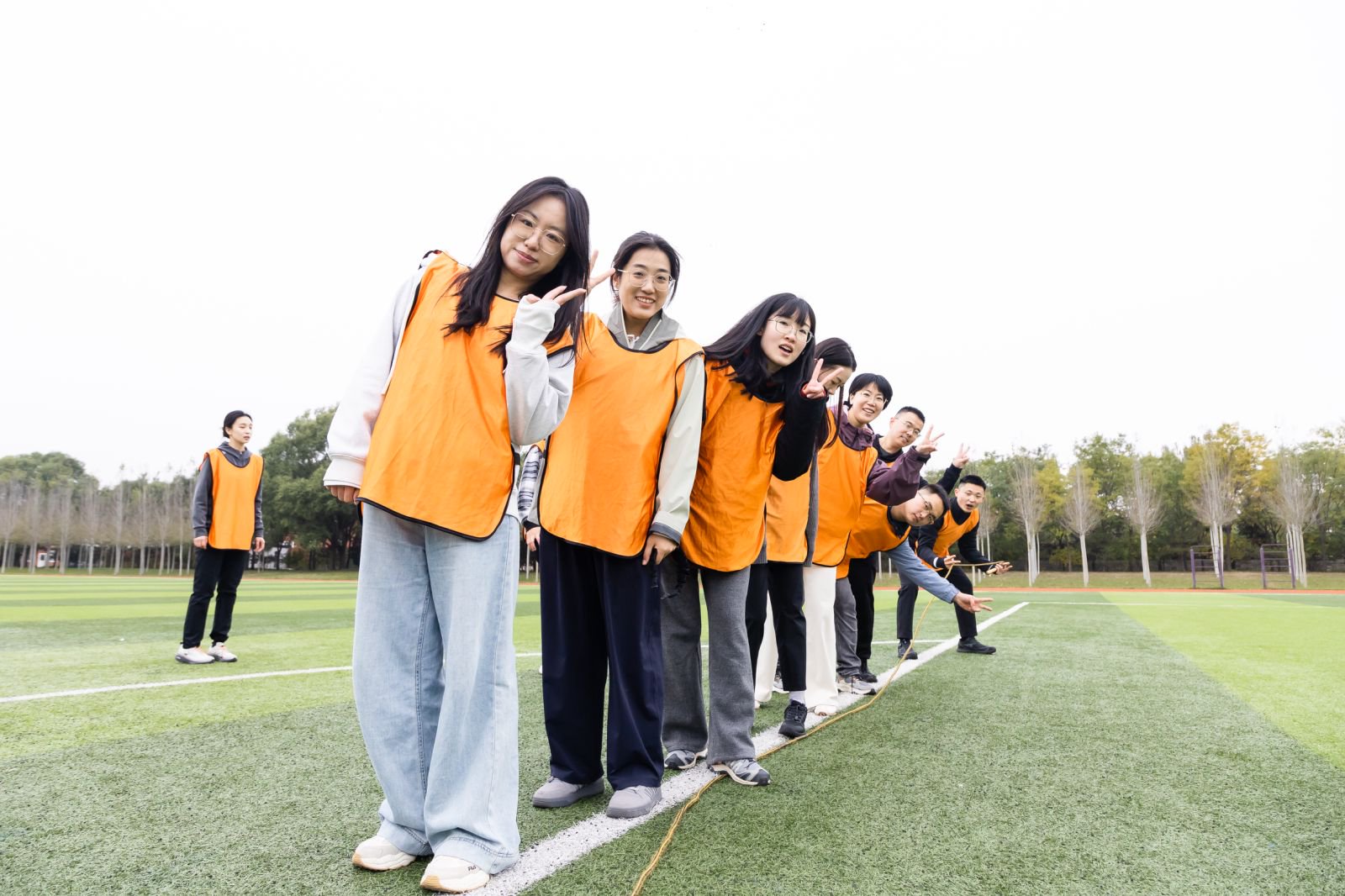 活动现场氛围热烈,三支战队以各具特色的队名亮相:绿队 “稳了稳了”自信满满,蓝队“深藏blue”幽默吸睛,橙队“太对了”活力十足。随后,“松鼠与大树”游戏迅速破冰,队员们积极组队,欢声笑语打破生疏。“同心鼓”环节考验协作,起初各队手忙脚乱,经讨论调整后渐入佳境,鼓点渐稳,球在鼓面弹跳,现场呐喊声不断。“挑战150”任务将气氛推向高潮,各队在跳大绳、集体拍手等项目中紧密配合,失误后快速调整,场边助威声此起彼伏。最后,“同心笔”环节为活动画上句号。三支队伍合力操控巨笔,分工明确,共同书写嵌有全员姓名的七言联句,将团队智慧与情谊凝聚于笔尖。