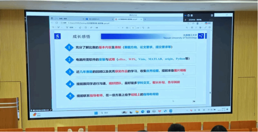 在学科竞赛方面,硕士研究生原媛深入剖析了学科竞赛的备赛逻辑,根据不同赛事特点分类解读其能力考察重点。她系统演示了如何制定科学的备赛时间轴,将整体任务合理分解为阶段性目标,并强调团队协作与资源整合的关键作用。通过具体案例,生动展示了从赛题分析、方案设计到成果呈现的全过程优化方法,为同学们提供了一套可快速上手的竞赛实战指南。