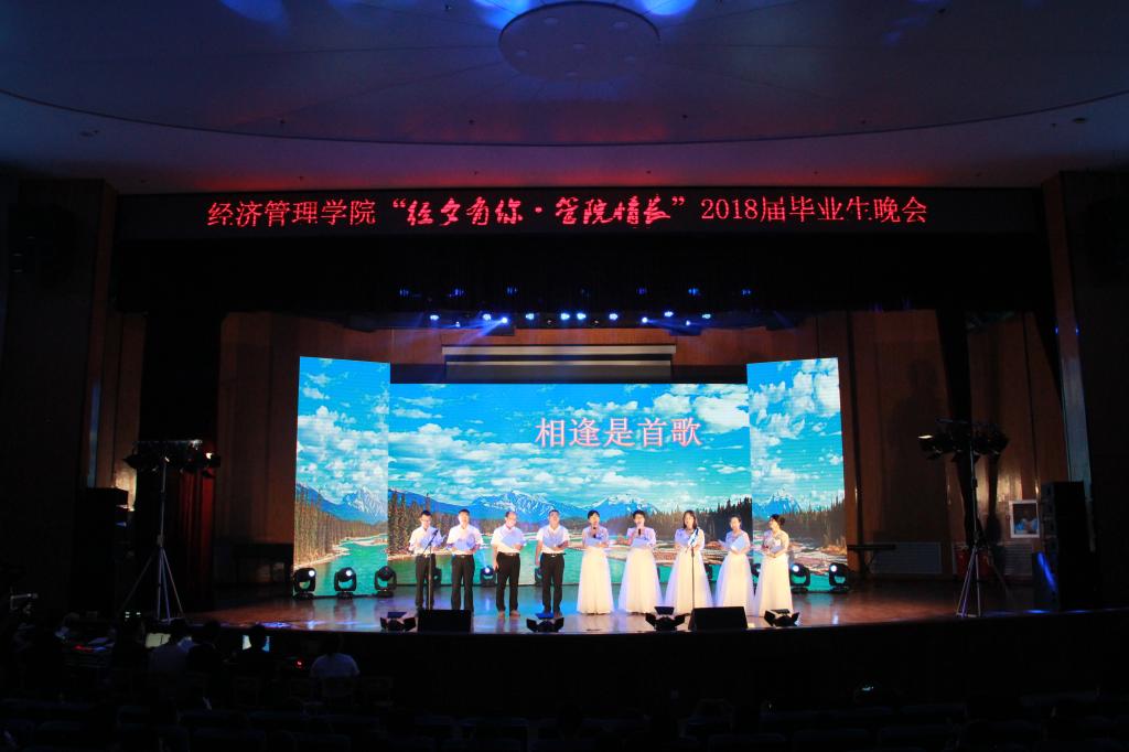 晚会上,除了记录大学四年点滴的视频和学生自编自演的节目,最令毕业生们感动的还是平时在课堂上威严端庄、学识渊博的教师们为他们精心准备的节目:经贸系教师身着节日的礼服,声情并茂地演唱与朗诵送上的《相逢是首歌》打动了在场的每一位毕业生;会计系师生们以手语表演的《感恩的心》告诉孩子们感恩这个伟大的时代;工商管理系教师别出心裁,用各自家乡的方言朗诵《再别康桥》引发高潮迭起的掌声让大家感受到了家的温暖;栗继祖副院长与管理科学系的教师与台下同学同唱《明天会更好》,为毕业生送上最真诚的祝福。