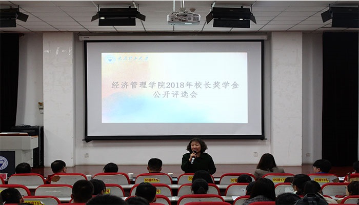 11月12日中午,经济管理学院在我校明向校区经管楼二层报告厅召开2018年校长奖学金公开评选会。院党委书记李玮、党委副书记杨振东、副院长陈怀超、学工办主任梁泽莹、经贸系主任薛晔、会计系副主任张永红、辅导员郝晓飞以及学生代表张健、陈立闻担任评委,200余名学生代表观摩了评选会。