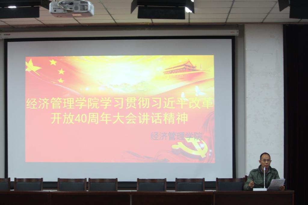 12月18日下午,经济管理学院于我校明向校区经管楼二层报告厅召开全体教职工大会,学习贯彻习近平改革开放40周年大会讲话精神。经济管理学院党委书记李玮、副院长陈怀超、工会主席李义民、党政办主任戴鸢、学工办主任梁泽莹出席会议。经济管理学院全体教师参加会议。