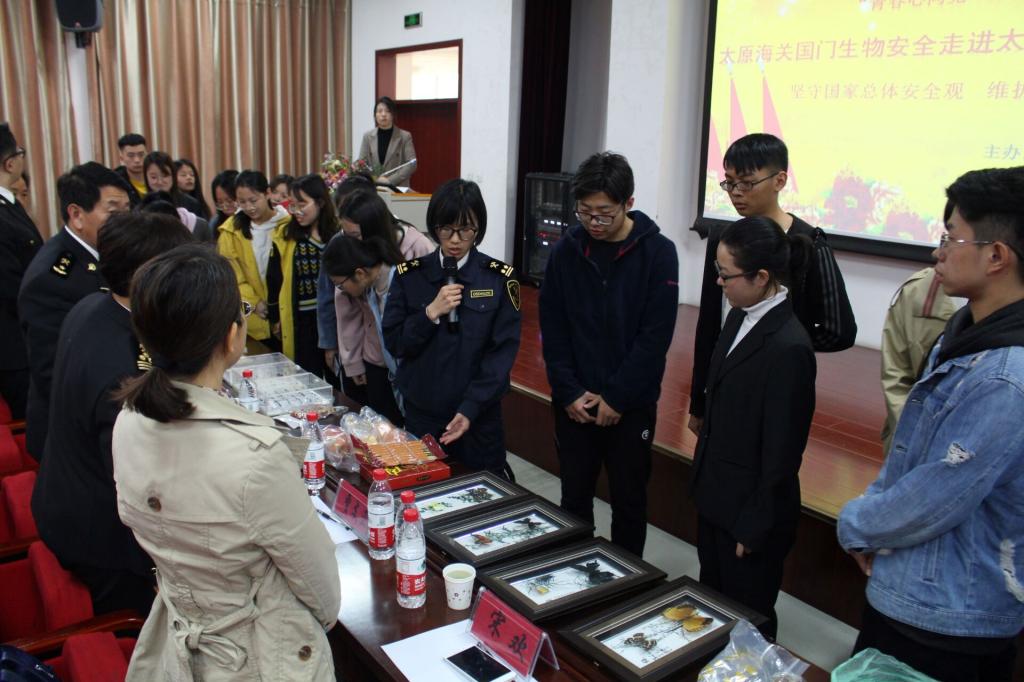 活动中,海关工作人员分别为大家介绍了非洲猪瘟和禁止携带、邮寄禁忌的动植物产品的相关知识,来自太原机场海关的特殊“嘉宾”——检疫犬小贝进行了检疫表演,与会同学还参观了由太原海关的工作人员带来的动植物标本,并与工作人员进行了友好的互动交流。
