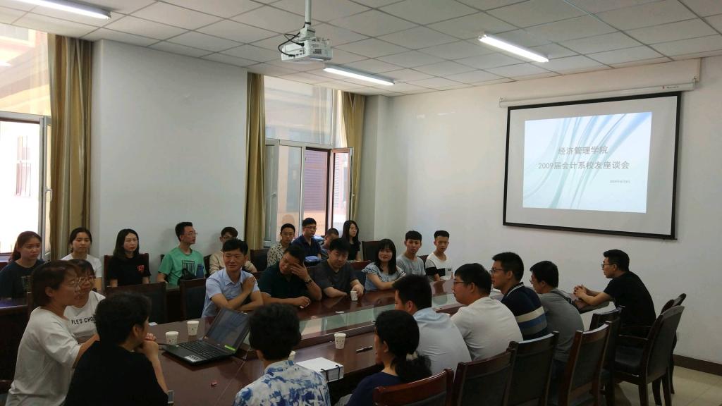 6月9日上午10:00,经济管理学院会计系2009届校友座谈会在经济管理学院226会议室召开,会计系新老系主任王聪、赵丽萍等六位老师、九位2009届会计毕业生和近30名会计专业本科生和硕士生一起参加座谈,会议由院学工办主任梁泽莹主持。