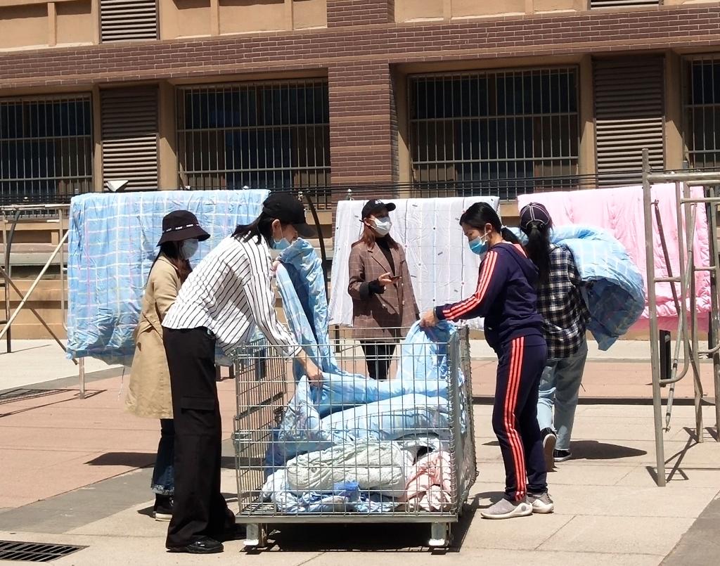 在公寓服务中心发出“云接单晒被”的通知后,同学们反应热烈,纷纷填写个人信息,进行扫码报名。本着“竭诚服务、认真标记、物归原位”的原则,公寓阿姨带领着大四的志愿者们按照提交的报名表,有条不紊地进行取被、标记、运被、晒被、收被、放回等工作,进一步落实了疫情请见的防控措施,为同学们的身心提供安全保障。志愿者们的暖心之举受到了同学们的一致好评!