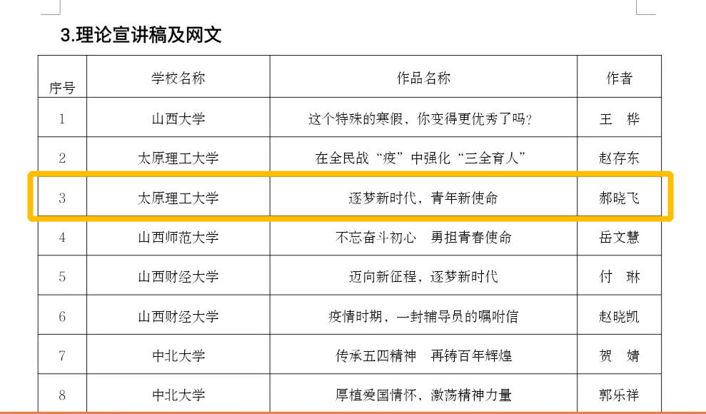 近日,山西省教育厅发布了2020年度山西省高校辅导员优秀工作成果公示名单,本次评选全省26所高校参加,共评选出83项优秀作品,包括工作案例、微课程、理论宣讲稿及网文、微(短)视频等四个类型。开云官网郝晓飞老师的《逐梦新时代,青年新使命》入选“理论宣讲稿及网文”类优秀成果。