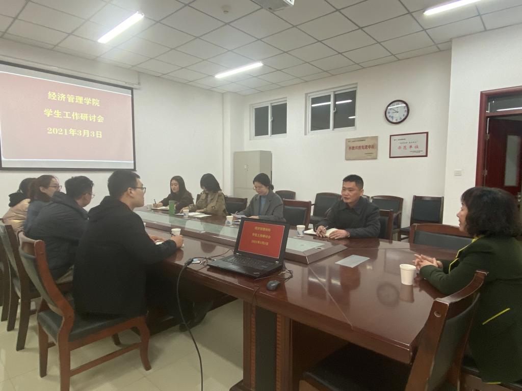 3月3日下午,经济管理学院在明向校区经管楼226会议室召开学院学生工作研讨会,院党委书记李玮出席,学院全体辅导员参会,会议由院党委副书记杨振东主持。