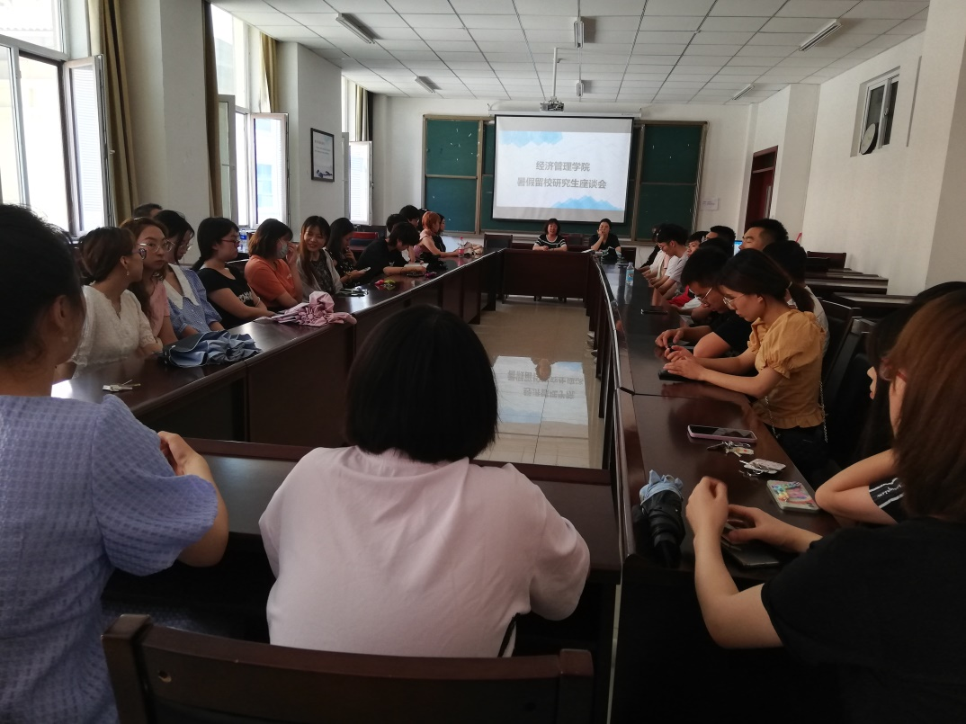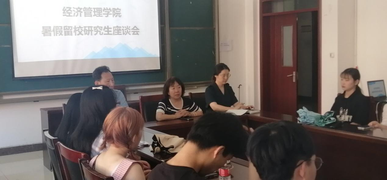 8月6日中午,经济管理学院在经管楼研教五召开了暑假留校研究生座谈会,院党委书记李玮、团委书记郝晓飞、研究生辅导员韩宝玉以及全体暑假留校研究生参加了座谈会。