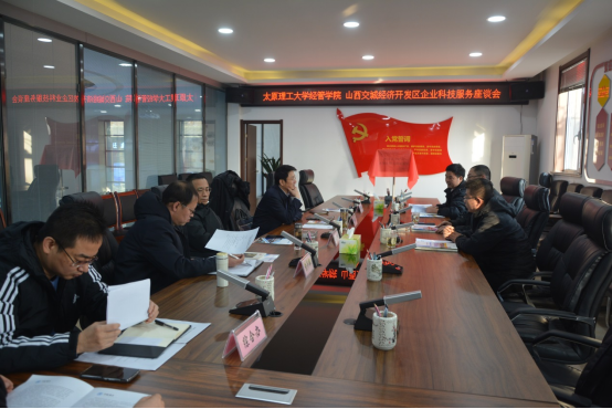 座谈会上,栗院长简要介绍了本次来访的背景与目的,深入阐述了经管学院的专业设置、师资力量、研究机构、科研成果、社会服务和学院特色,详细介绍了学院能够在技术咨询、业务培训、科学研究和职业发展等领域提供的企业服务,表示学院将以本次活动为契机,促进更多教师走入交城企业,创新企业服务形式,提升企业服务实效。李主任对学院来访表示热烈欢迎,介绍了开发区概况及其推出的“五个一批、三个机制”的企业科技特派员对接模式,提出了深化企业科技特派员工作之“务实和开放”两大理念及其具体举措。