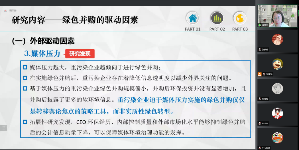 院长栗继祖教授对潘爱玲教授的到来表示热烈的欢迎与感谢,希望通过潘爱玲教授等学科领军人物开展交流、分享经验,来帮助会计学专业不断提高建设水平。讲座中,潘爱玲教授详细介绍了绿色并购的研究由来、相关概念、内外部驱动因素及效益评价等方面,帮助师生更全面理解绿色并购的意义和研究方向。