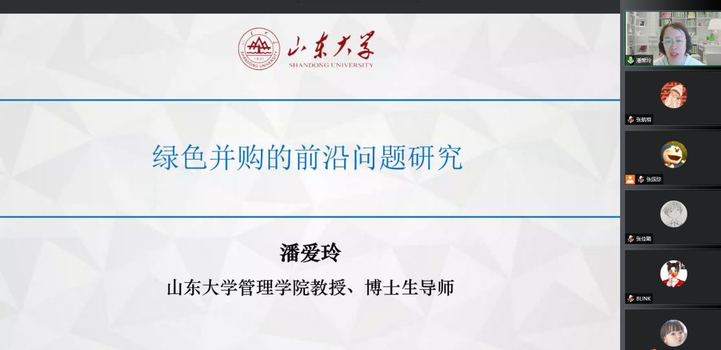 7月8日上午,山东大学管理学院二级教授、会计学科带头人、山东省会计学重点学科负责人潘爱玲教授受邀进行了讲坛第一讲,以《绿色并购的前沿问题研究》为题进行了交流分享,全院师生一百五十余人线上参加。