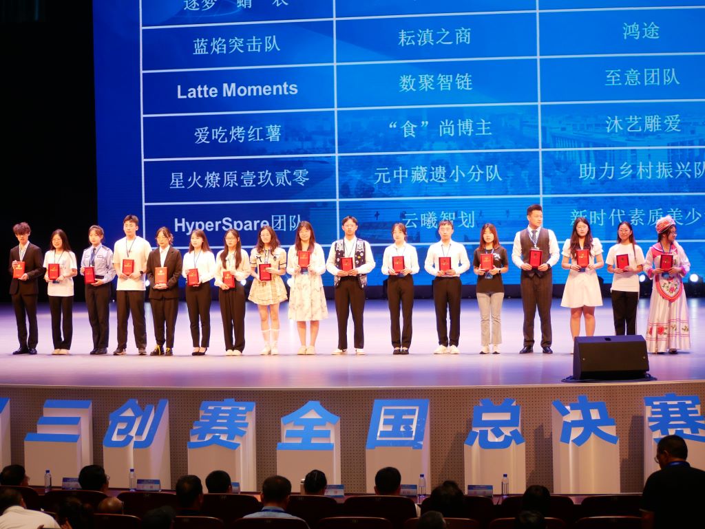 我校本次共有四支队伍晋级全国总决赛,其中,由温芝龙和张荣霞指导“数聚智链”团队、曹锐和温芝龙指导“云曦智划”团队、谢红薇和曹若琛指导“Latte Moments”团队在全国总决赛上喜获一等奖;谢红薇和曹若琛指导的“诗与远方”团队获得全国二等奖。同时“数聚智链 ”团队获得最佳创新奖和创意奖,温芝龙、张荣霞、曹锐、谢红薇、曹若琛等5位教师获得优秀指导老师。