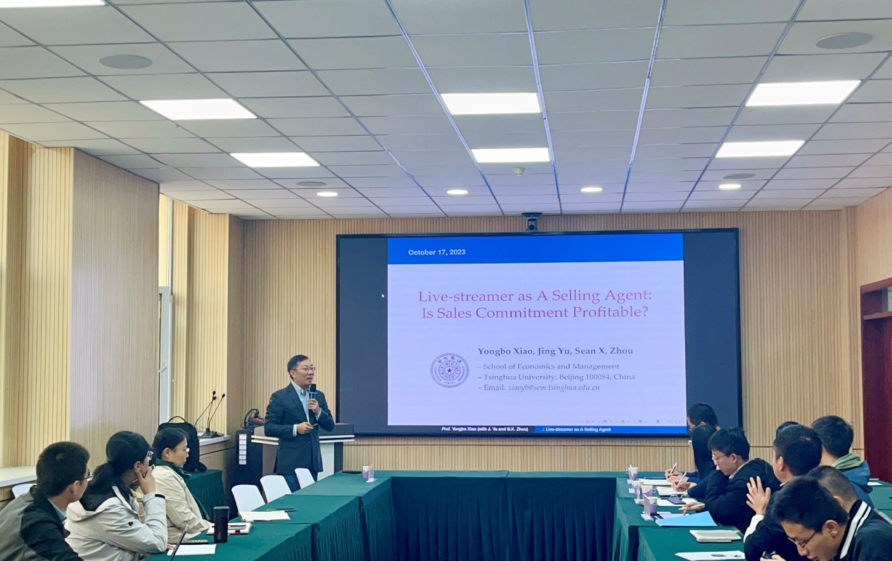 10月17日上午,清华大学肖勇波教授应邀来经济管理学院进行学术交流,并作了题为“寻找有趣的运营与供应链管理研究话题”和“Live-streamer as A Selling Agent: Is Sales Commitment Profitable?”的学术报告。报告由经济管理学院院长栗继祖主持,学院党委书记闫新、副院长陈怀超和姚西龙以及多名师生聆听了本次报告。