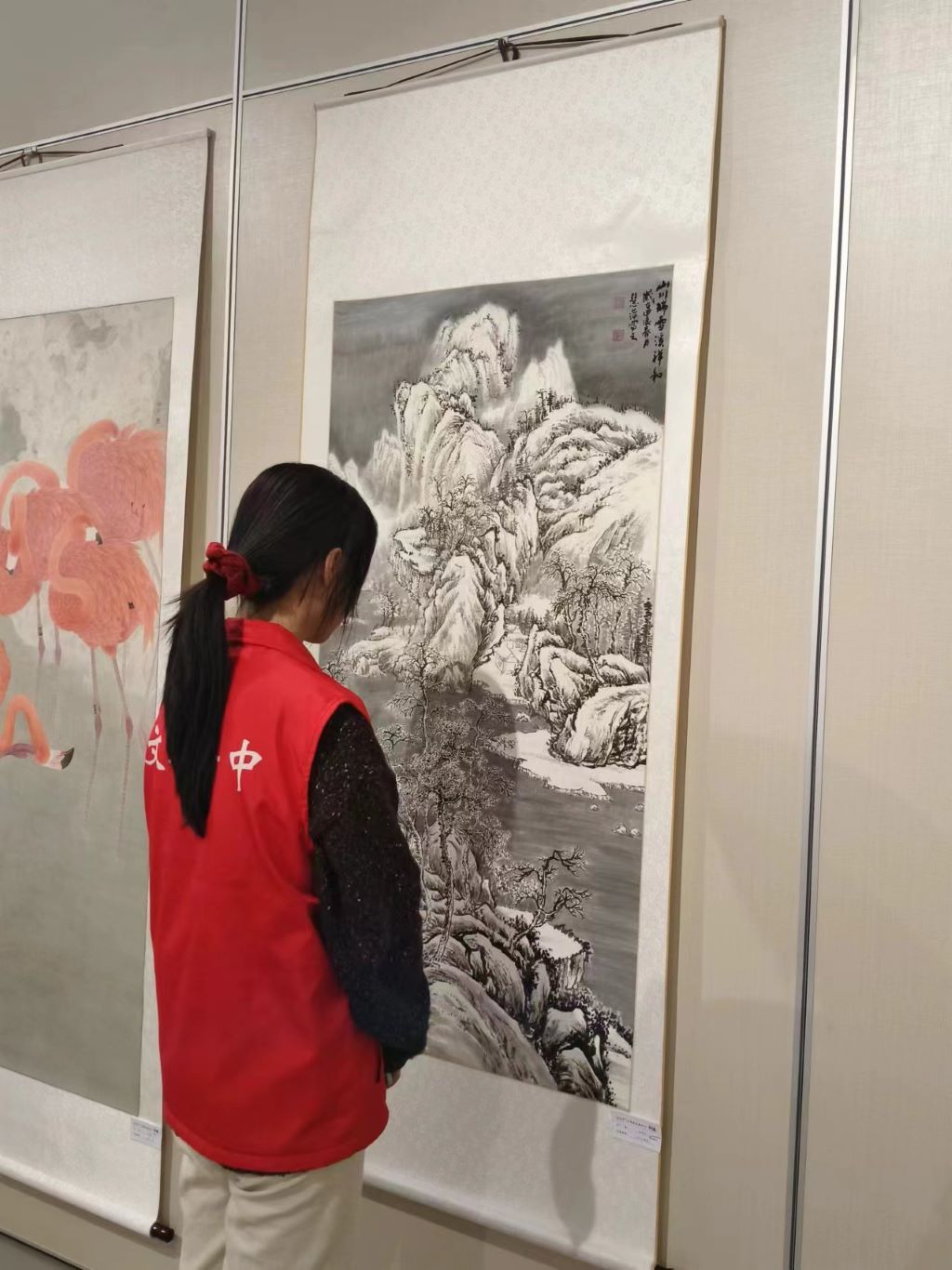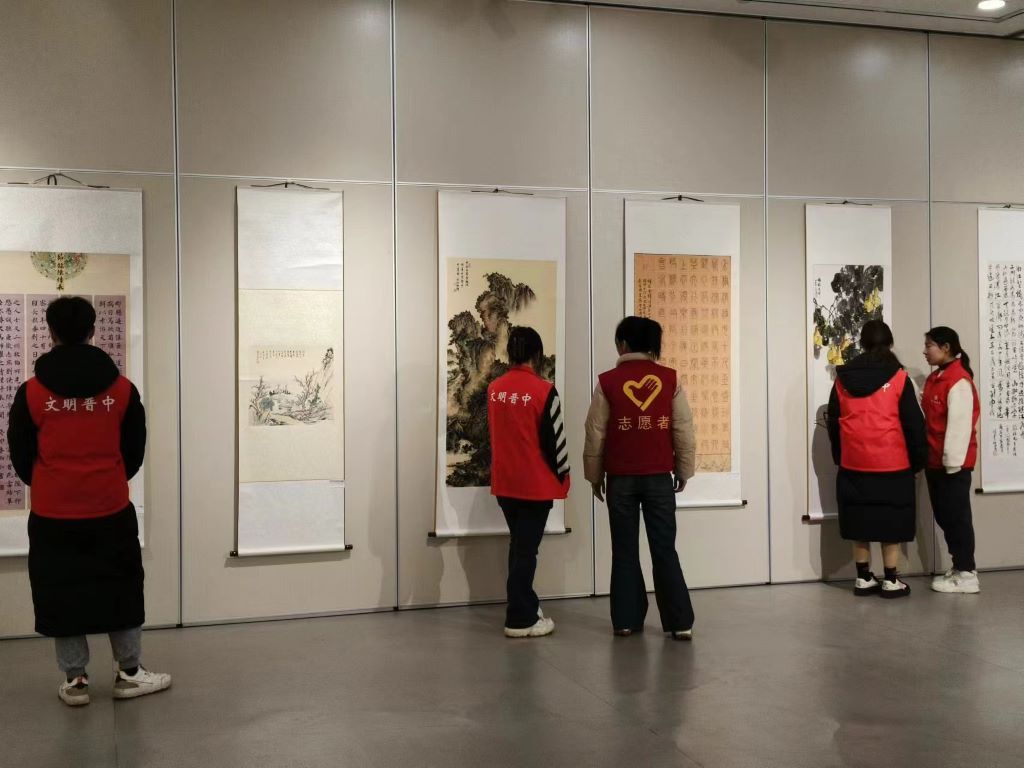 翰墨飘香润心田,丹青溢彩贺华章:基础工作做完之后,志愿者同学们自发参观了“巾帼建功新时代书画展”,领略到铿锵玫瑰的芳华力量,了解独特、细腻、唯美的艺术世界。