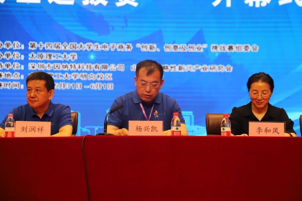 5月31下午三点,大赛开幕式在我校明向校区学生活动中心举行。校党委副书记刘润祥,教育部高等学校电子商务类专业教学指导委员会委员、东北财经大学杨兴凯,教育部高等学校电子商务类专业教学指导委员会委员、首都经济贸易大学郭卫东,全国电子商务产教融合创新联盟副理事长单位、电子商务三创赛竞赛组委会专家、深圳市因纳特科技有限公司总经理胡强,我校党委学生工作部、团委、创新创业学院负责人,经济管理学院院长栗继祖以及山西赛区选拔赛的评审专家等领导嘉宾出席开幕式。开幕式由经济管理学院党委书记闫新主持。