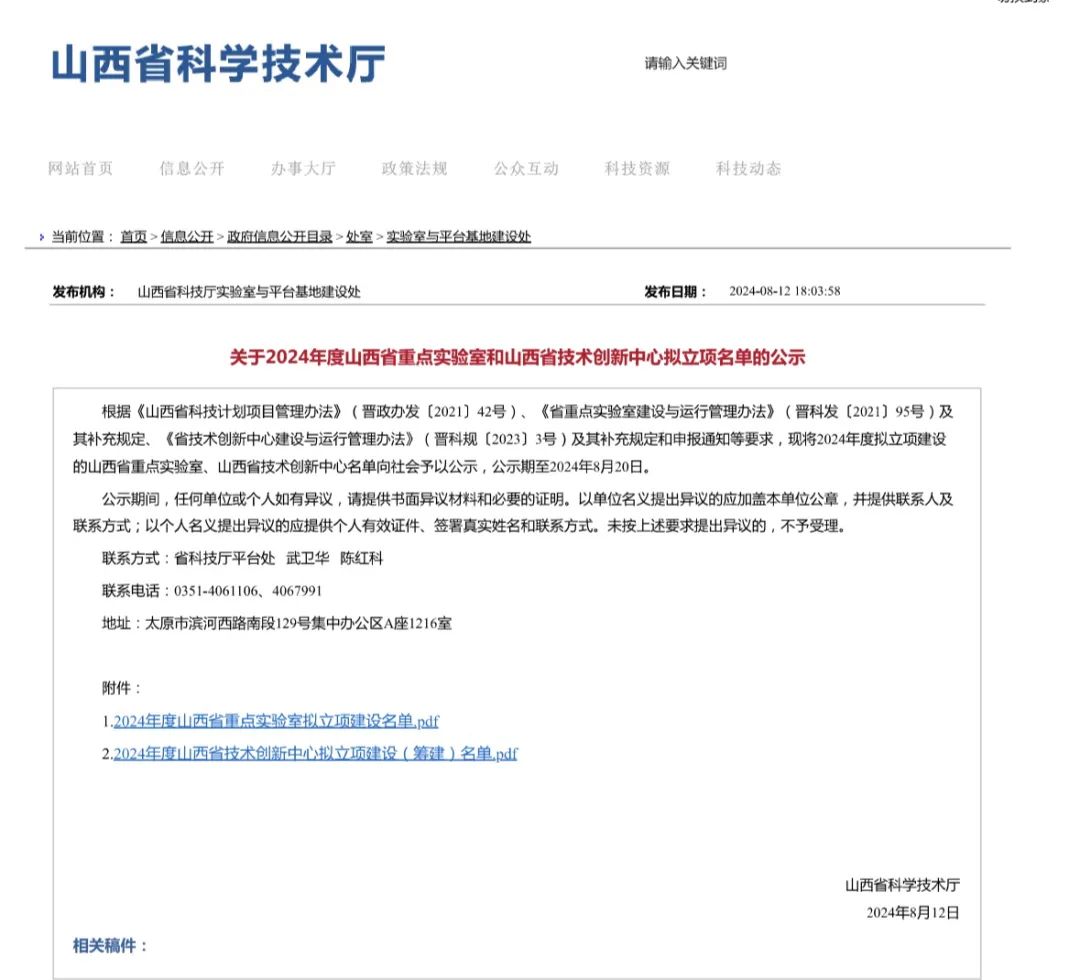 近日,山西省科学技术厅公布了2024年度山西省重点实验室和山西省技术创新中心拟立项名单。