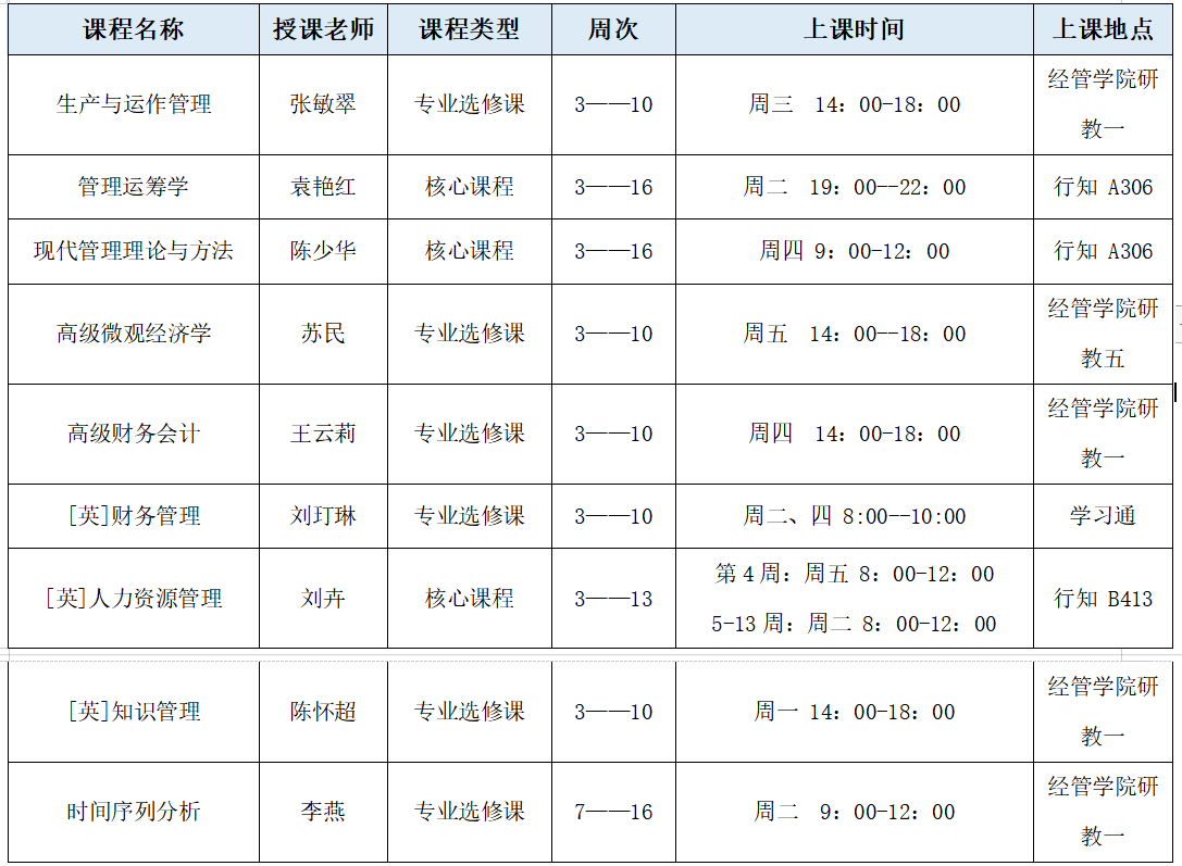 经管学院2020级普硕春季课程表
