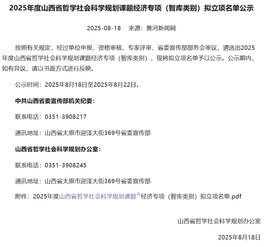 8月18日,山西省哲学社会科学规划办公室发布了“2025年度山西省哲学社会科学规划课题经济专项(智库类别)拟立项名单公示”,开云官网李竹梅等5位教师申报项目获拟立项资助,占全校立项总数的62.5%。