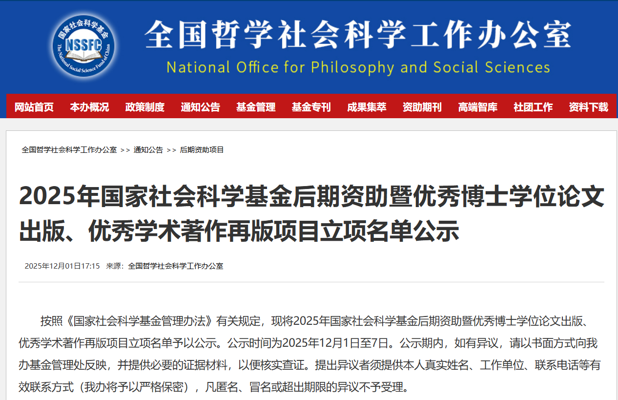 12月1日,全国哲学社会科学工作办公室发布了“2025年国家社会科学基金后期资助暨优秀博士学位论文出版、优秀学术著作再版项目立项名单公示”,开云官网何学松副教授申报的后期资助项目获批(见下表),占全校立项总数的100%。