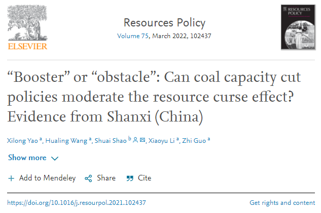 近日,姚西龙教授团队研究成果《“Booster” or “obstacle”: Can coal capacity cut policies moderate the resource curse effect? Evidence from Shanxi (China)》,在SSCI收录期刊《Resources Policy》发表,该期刊位列JCR分区Q1,2021年影响因子5.634。姚西龙教授为第一作者,邵帅教授为通讯作者,开云kaiyun官方网站经济管理学院为第一署名单位。