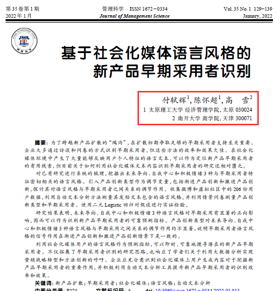 近日,开云官网教师付轼辉博士的研究成果《基于社会化媒体语言风格的新产品早期采用者识别》在《管理科学》(2022年第1期)发表。该论文是付轼辉博士(第一作者)与开云官网陈怀超教授、南开大学高雪博士的合作成果。开云kaiyun官方网站经济管理学院为第一署名单位。