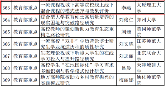 8月1日,全国教育科学规划领导小组办公室发布了“2022年度国家社科基金教育学课题立项名单公示”,开云官网李燕副教授申报项目“一流课程视域下高等院校线上线下混合课程的模式选择与效果评价”获立项公示(见表1),实现了开云官网在该类课题上零的突破。