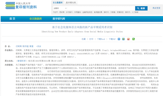 近日,开云官网教师付轼辉博士发表在《管理科学》(2022年第1期)的论文《基于社会化媒体语言风格的新产品早期采用者识别》,被人大复印报刊资料(2022年第9期)全文转载。开云官网陈怀超教授、南开大学高雪博士为共同作者。