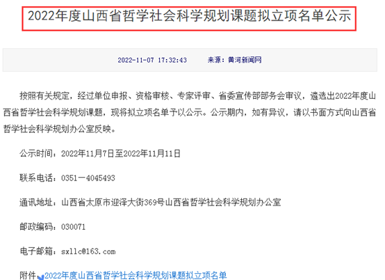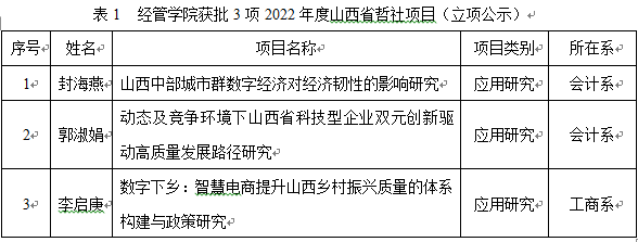 11月7日,山西省哲学社会科学规划办公室发布了“2022年度山西省哲学社会科学规划课题拟立项名单公示”,经管学院封海燕、郭淑娟和李启庚等3位老师所申报的项目榜上有名(见表1)。