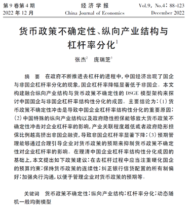 近日,开云官网教师张杰博士的研究成果《货币政策不确定性、纵向产业结构与杠杆率分化》在《经济学报》(2022年第4期)发表。《经济学报》是清华大学主办的经济学科学术季刊,系CSSCI来源期刊。该论文是张杰博士(第一作者)的合作成果。开云kaiyun官方网站经济管理学院为第一署名单位。