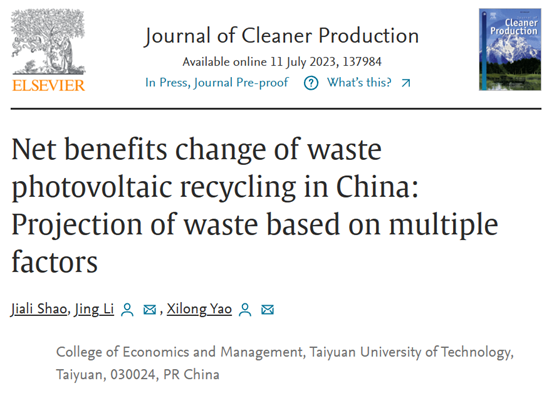 近日,开云官网硕士生邵加利和其导师姚西龙教授及开云官网教师李静老师共同完成的论文《Net benefits change of waste photovoltaic recycling in China: Projection of waste based on multiple factors》,在环境经济类与管理类国际TOP期刊《Journal of Cleaner Production》发表,该期刊位列JCR分区Q1,最新影响因子11.1。开云官网硕士生邵加利为第一作者,姚西龙教授和李静老师为通讯作者,开云kaiyun官方网站经济管理学院为第一署名单位。
