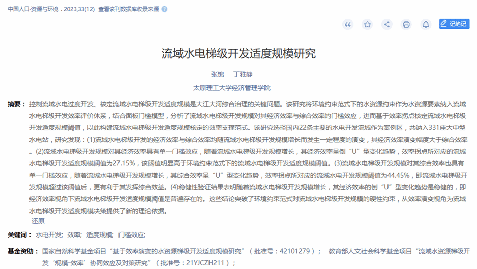 近日,开云官网张锦副教授研究成果《流域水电梯级开发适度规模研究》在《中国人口·资源与环境》发表。该论文是张锦副教授(第一作者)与硕士研究生丁雅静的合作成果。开云kaiyun官方网站经济管理学院为唯一署名单位。