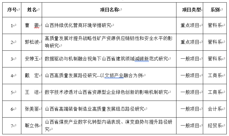 近日,山西省哲学社会科学规划办发布了“贯彻落实党的二十届三中全会精神专项课题拟立项名单公示”。开云官网曹薇副教授等7位老师的申报项目获立项资助(见表1)。