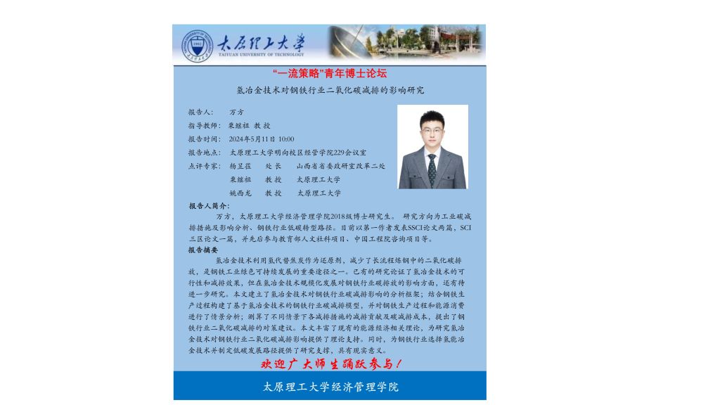“一流策略”青年博士论坛:氢冶金技术对钢铁行业二氧化碳减排的影响研究
