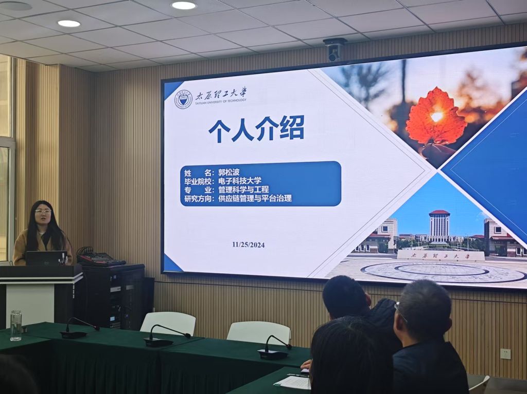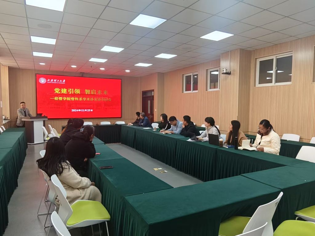 为促进学术交流、激发创新思维,管科系举行“党建引领 智启未来——学术沙龙系列活动”。11月25日,郭松波博士在学院229会议室,作了题为“混合平台运营模式选择与资源共享策略研究”的首场学术分享,学院副院长王天日教授和管科系近20名教师参加了本次活动,活动由管科系副主任何学松副教授主持。