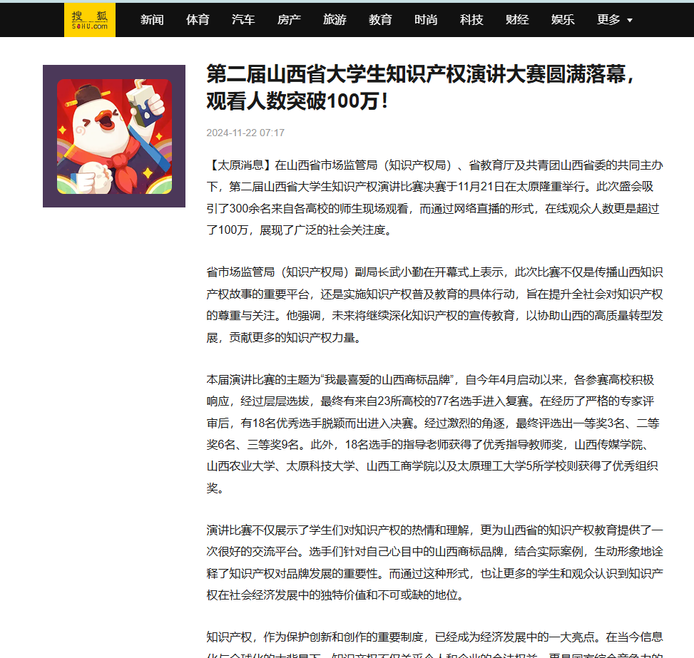 【太原消息】在山西省市场监管局(知识产权局)、省教育厅及共青团山西省委的共同主办下,第二届山西省大学生知识产权演讲比赛决赛于11月21日在太原隆重举行。此次盛会吸引了300余名来自各高校的师生现场观看,而通过网络直播的形式,在线观众人数更是超过了100万,展现了广泛的社会关注度。