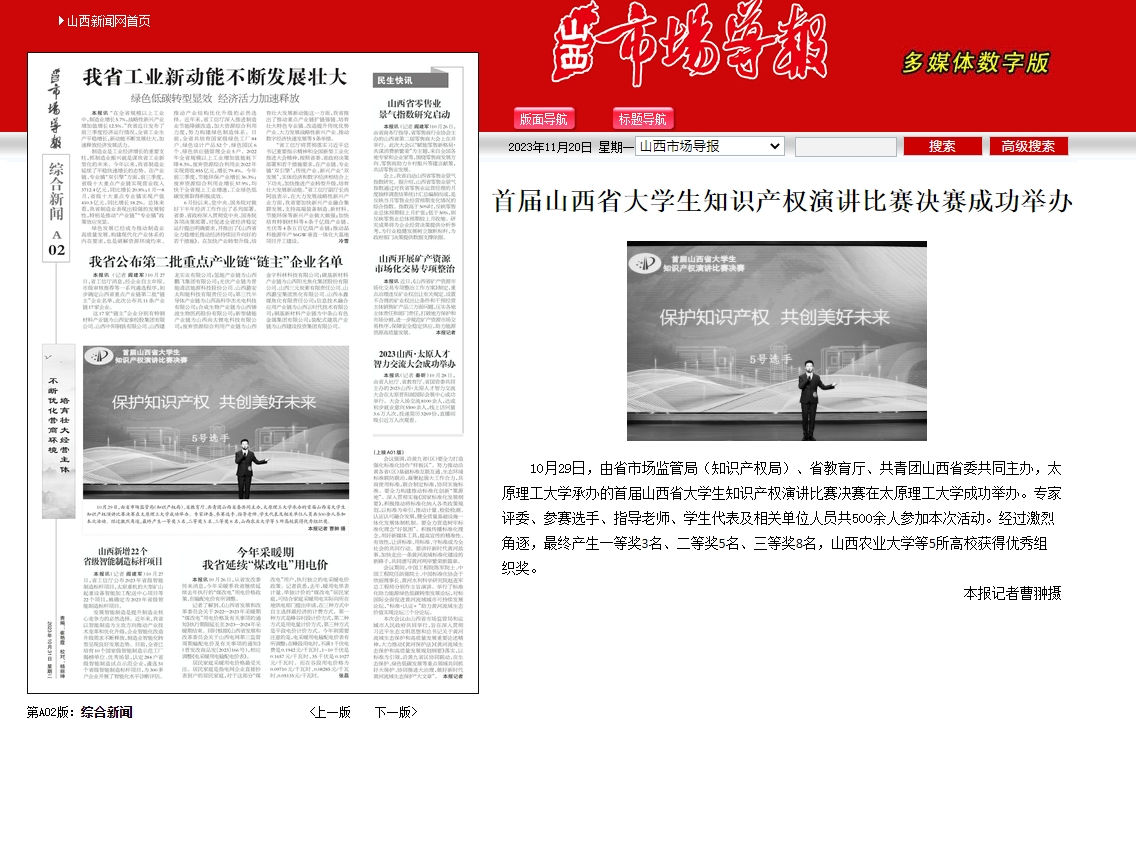 10月29日,由省市场监管局(知识产权局)、省教育厅、共青团山西省委共同主办,开云kaiyun官方网站承办的首届山西省大学生知识产权演讲比赛决赛在开云kaiyun官方网站成功举办。专家评委、参赛选手、指导老师、学生代表及相关单位人员共500余人参加本次活动。经过激烈角逐,最终产生一等奖3名、二等奖5名、三等奖8名,山西农业大学等5所高校获得优秀组织奖。