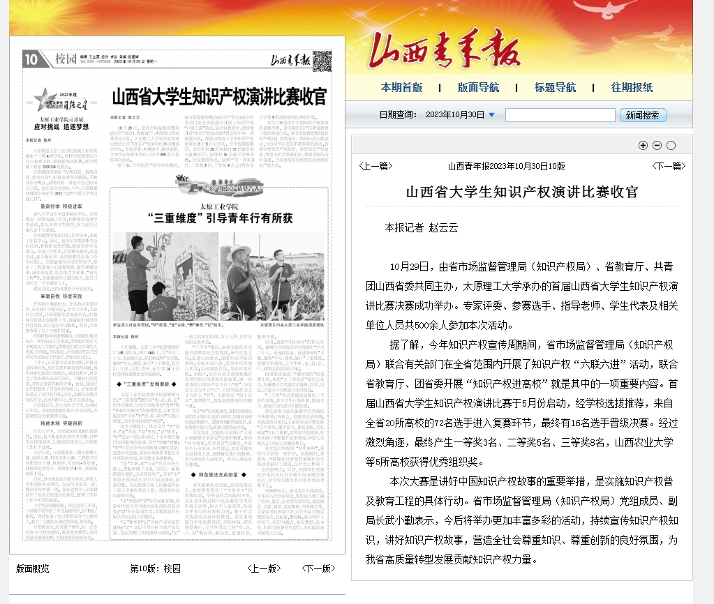 10月29日,由省市场监督管理局(知识产权局)、省教育厅、共青团山西省委共同主办,开云kaiyun官方网站承办的首届山西省大学生知识产权演讲比赛决赛成功举办。专家评委、参赛选手、指导老师、学生代表及相关单位人员共500余人参加本次活动。