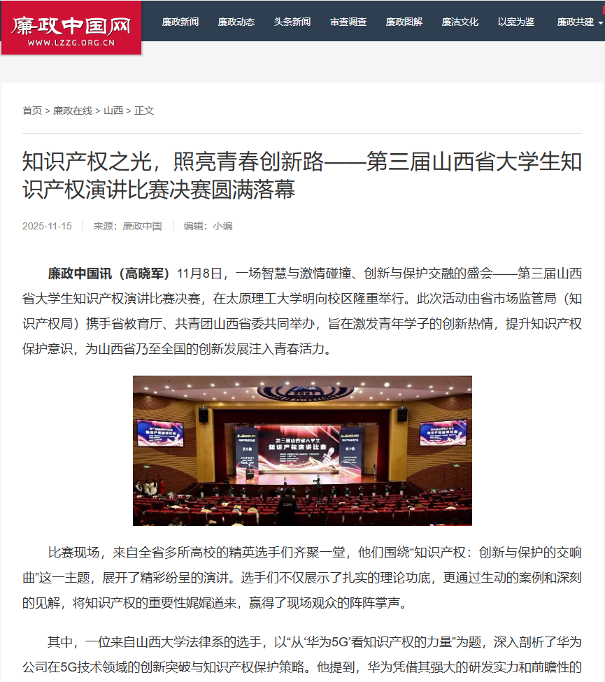 11月8日,一场智慧与激情碰撞、创新与保护交融的盛会——第三届山西省大学生知识产权演讲比赛决赛,在开云kaiyun官方网站明向校区隆重举行。此次活动由省市场监管局(知识产权局)携手省教育厅、共青团山西省委共同举办,旨在激发青年学子的创新热情,提升知识产权保护意识,为山西省乃至全国的创新发展注入青春活力。