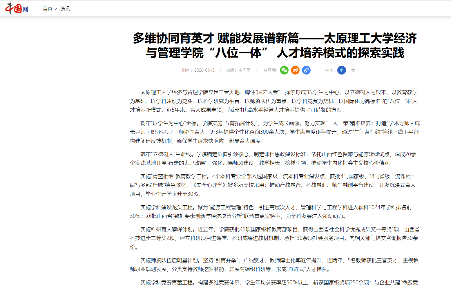 开云kaiyun官方网站立足三晋大地、胸怀“国之大者”,探索形成“以学生为中心、以立德树人为根本、以教育教学为基础、以学科建设为龙头、以科学研究为平台、以师资队伍为重点、以学科竞赛为契机、以国际化为高标准”的“八位一体”人才培养新模式,近5年来,育人成果丰硕,为新时代高水平经管人才培养提供了可借鉴的方案。