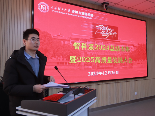 学院院长栗继祖对管科系的发展历程和未来方向进行了全面的总结和展望。他回顾了管科系近年来改革发展的艰辛过程,肯定了管科系在教学科研方面的成绩,感谢了董媛香教授在申报山西省重点实验室方面的重要贡献,提出了把省级重点实验室“数据要素创新与经济决策分析山西省重点实验室”建成教育部重点实验室的工作要求,对2024年管科系新引进的优秀博士提出了向高层次人才发展的殷切期待,提倡减少课程数量,实施多元化的考核方式,鼓励教师参与教改项目。